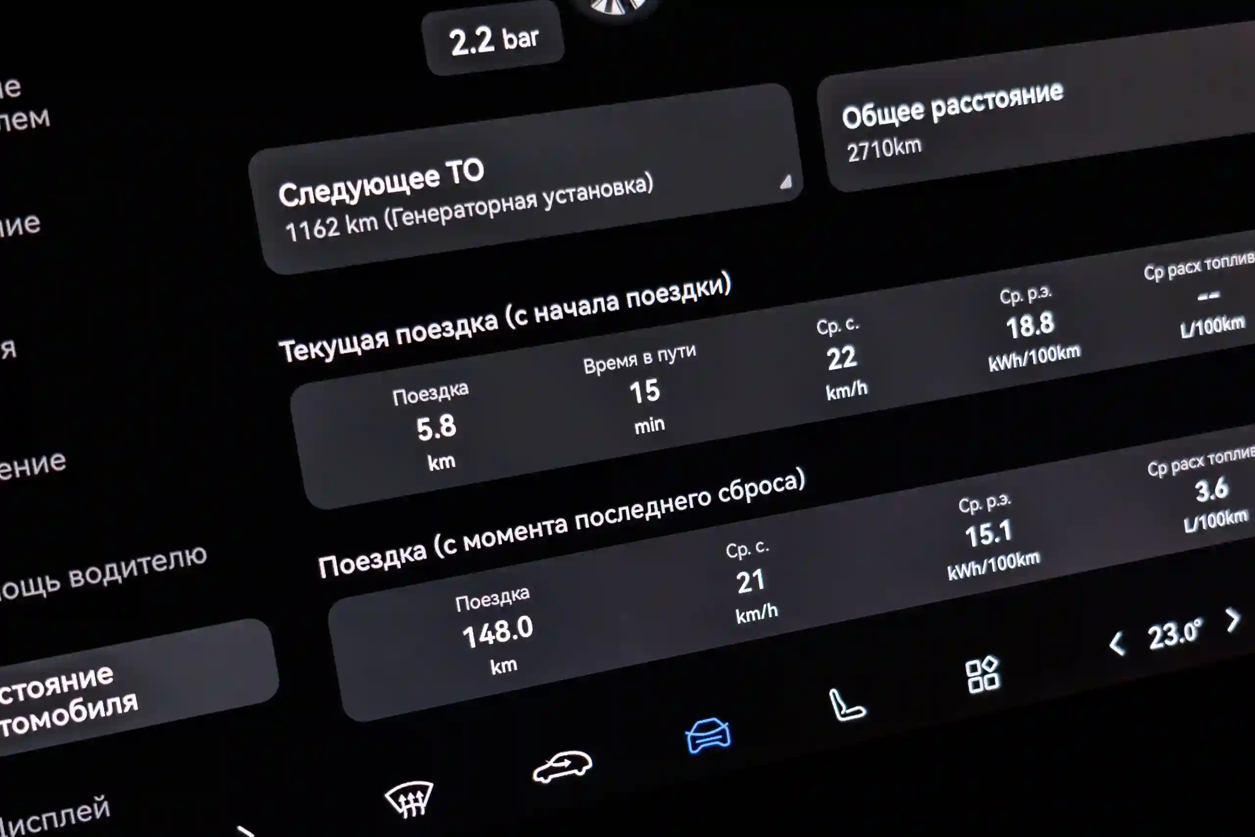 У новой модели в автоматическом режиме тише работает кондиционер и чуть мощнее замедление при стандартном среднем уровене рекуперации. Это может служить объяснением, почему она оказалась экономичнее дорестайлинговой в мерном параллельном заезде в режиме EV при одинаковых настройках. Первая «привезла» расход (по БК) 18,8 кВт·ч/100 км, а старая, обутая в точно такие же шины с тем же давлением — 21,2 кВт·ч/100 км.